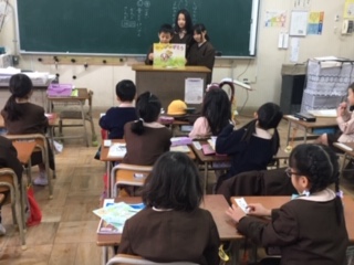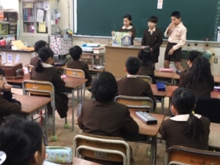 図書委員会の子どもたちが今朝も低学年の教室を回って紙芝居の読み聞かせをしています。静かにしっかりと聞いています。