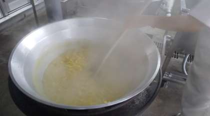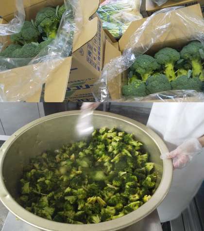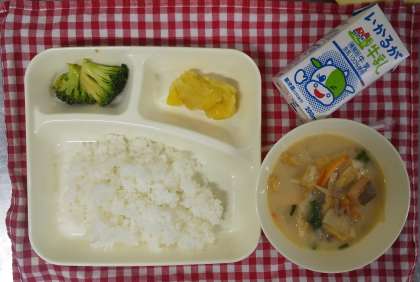今日の給食には、おせち料理のくりきんとんの他、寒い時期に体が温まるかすじる、今が旬のブロッコリーを使ったブロッコリーのしょうがづけ、ご飯、牛乳でした。酒かすが苦手な子にも食べやすいように給食のかす汁には、みそを加えています。
