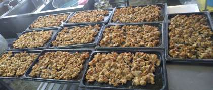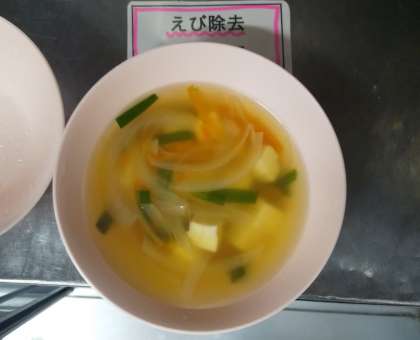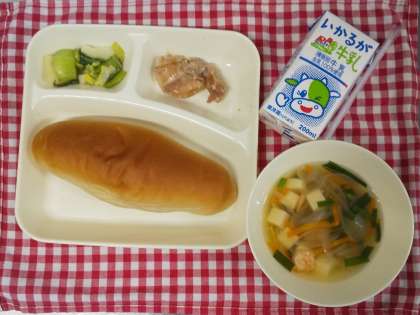 今日の献立は、鶏肉のオイスターソース焼き、えびととうふのスープ、チンゲンサイのピリ辛あえ、黒糖パン、牛乳でした。オイスターソースは牡蠣を使った中国の調味料です。料理にコクとうま味が加わります。スープはえびアレルギーがある児童も食べられるように除去食を用意しました。