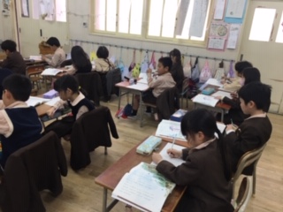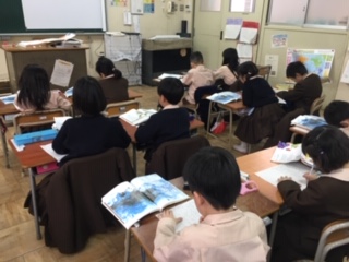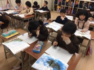 「スイミー」の学習に入りました。初めて読んだ感想をしっかりと書いています。好きな場面はどこ?と尋ねると、海の中のクラゲやイセエビが出てくるところ、みんなが一つになって大きな魚を追い出したところなどいろいろでした。挿絵も参考にしながら読み深めていきます。