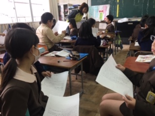 「人をつつむ形」で読み取ったことを自分の体験や感想、その国の人の気持ちなどを考えて、紹介文を書いています。今日は、モンゴルの「ゲル」について書き、友達と交流しました。