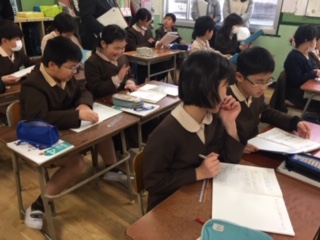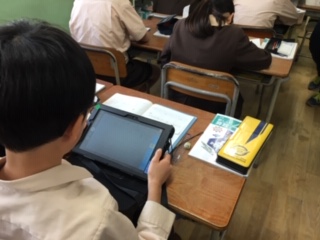 6時間目、「変わり方」の単元で、正三角形の数と周りの長さの関係について調べました。表を書いて考えていくと、きまりが見つかり、式に表すことができました。ノートに書いた自分の考えをタブレットで撮って映して共有しました。見つけた法則を使って練習問題もすぐに解くことができました。