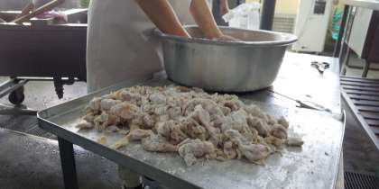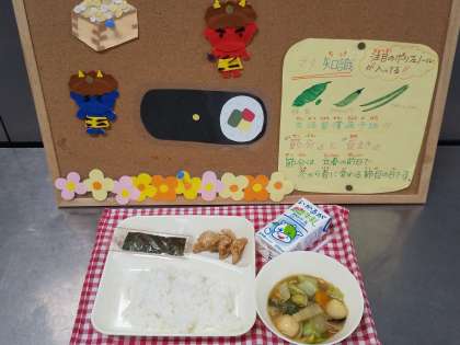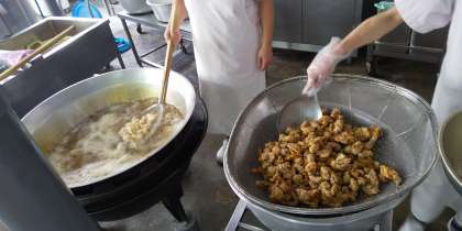 今日は、鶏肉のからあげ、まる天と野菜のうま煮、焼きのり、ごはん、牛乳でした。唐揚げは、給食室で丁寧に衣をつけて大きな釜で揚げます。子どもたちにも大人気です。