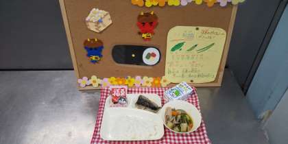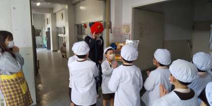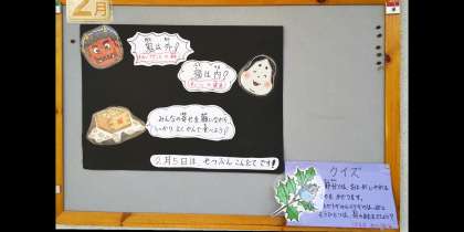 今日はいわしのしょうがじょうかけ、含め煮、いり大豆を組み合わせた節分献立でした。鬼が苦手ないわしの頭を柊の枝にさして玄関などに立てる習慣があることから、いわしの開きを使いました。「しっぽ以外全部食べた」や「骨も美味しかった」と小骨もしっかり噛んで食べれていたようです。給食室には、鬼も登場しました。鬼を吹きとばすように大きな声で挨拶していましたよ。