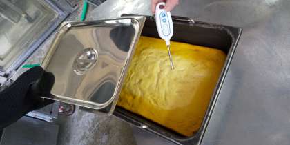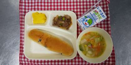 今日は、牛肉のデミグラスソース煮、コーンスープ、かぼちゃのプリン、レーズンパン、牛乳でした。プリンは、卵、かぼちゃ、牛乳、クリーム、砂糖だけの食品添加物を使用しない給食室の手作りです。大阪市では、安全で安心な給食のためにデザートも手作りを基本としています。