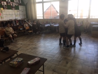 18日の参観では、いろいろな教科の学習の成果を発表す。その練習を班ごとに行っています。