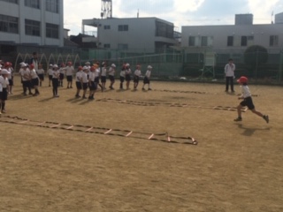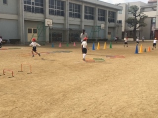 ラダー、ミニハードル、フラフープ、コーンなどを使ったサーキットを回りました。楽しみながら体作りの運動です。