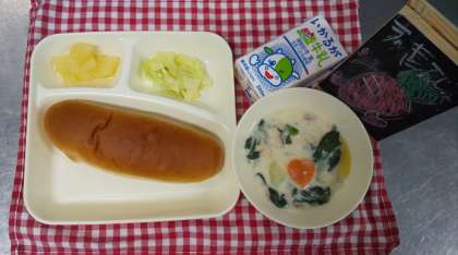 今日は、ほうれんそうのクリームシチュー、キャベツのサラダ、洋なし(缶詰め)、黒糖パン、牛乳でした。