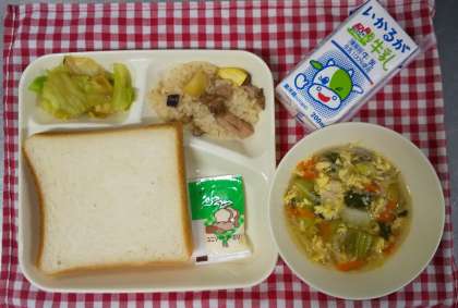 今日は、中華おこわ、卵スープ、キャベツのオイスターソースいため、食パン、マーガリン、牛乳でした。