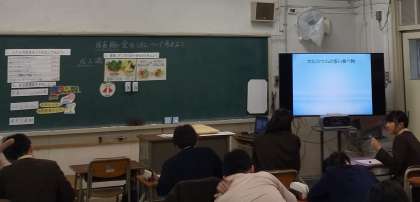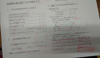 「成長期の食生活について考えよう」のテーマで今までの小学校での食育を思い出しながら自分の食生活についてふり返りました。「食」という字は「人を良くする」と書きます。これからは自分で自分自身を良くしていくためによい食生活を送ってほしいです。