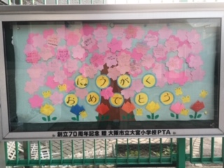 新入生の入学を祝ってPTAの役員の方々が、玄関の掲示板を飾ってくださいました。ありがとうございます。メッセージは、昨年度の「大宮フェスティバル」で書いてもらったものを掲示しています。