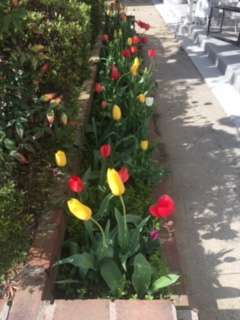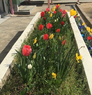 チューリップが子どもたちの登校を心待ちにしています・・・。