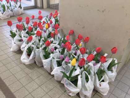 教科書等を受け取られましたら、そのまま進んで東側ピロティの東門からお帰りください。新1年生の保護者の方は、大宮地域から入学のお祝いのチューリップをお持ち帰り下さい。