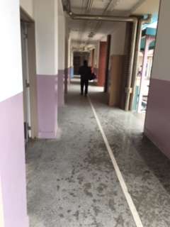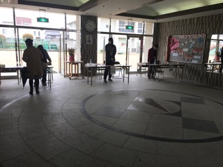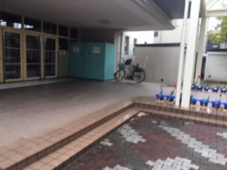 雨天のため、来校される方は少なく、お待ちいただくこともなくスムーズに流れています。自転車でお越しの方は、西門を入って講堂前に置いていただいています。