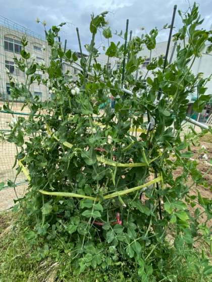 3学期にひまわり学級の児童が学習園に撒いたスナップエンドウが大きくなり、実ができました!支援員のY先生がよくお世話をしてくださっていました。子どもたちも水やりやスケッチをしていましたね。