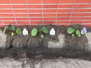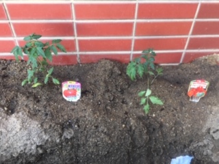 ナス、ミニトマトなどの苗が育ってきました。手前には来週、サツマイモを植える予定です。