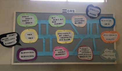 階段の掲示板に、子どもたちが登校した時元気になる歌の歌詞を貼っています。アミダを辿っていくと・・?知っている曲かな?