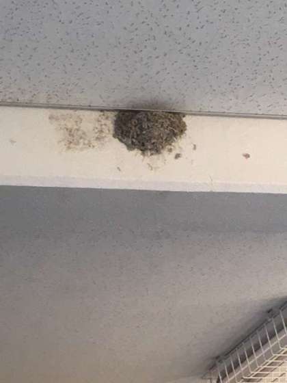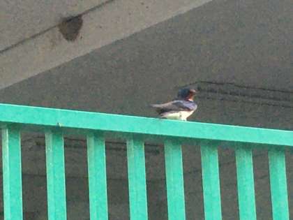 毎年一階ピロティにツバメが巣を作っています。泥は、ビオトープの田んぼから運んでいるようです。まだヒナの姿は見えません。親鳥が用心深く周りを見て卵を守っています。
