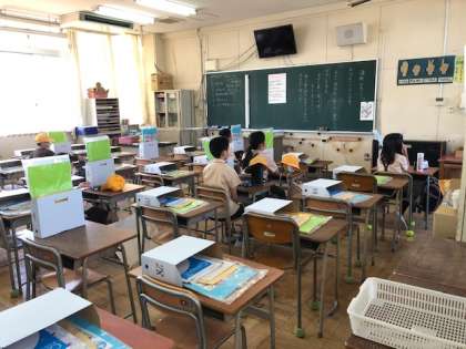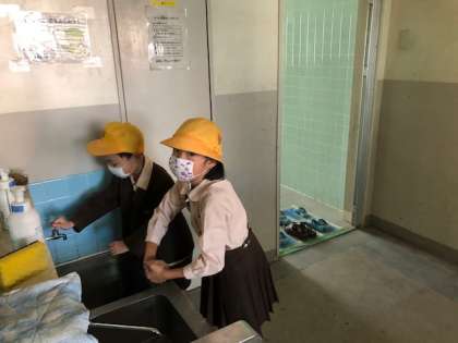 今日は3年・5年の久しぶりの登校です。登校した児童から教室に荷物を置いて、手洗いをしています。