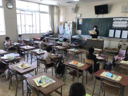 新しい教室、先生、友達との出会いです。プリントやマスク、図書カードなどたくさんの配り物があり、一つ一つ確認して連絡袋に入れました。