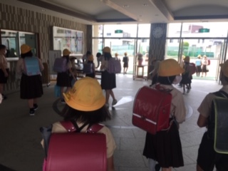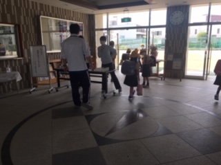 登校したら玄関で体温を測ってきているか、健康観察表をチェックしています。登校時間より早く来たり、検温をしていない子がたくさんいると、玄関が密になってしまいます。その場合は、運動場での待機など工夫をしています。出来るだけお家での検温をお願いします。