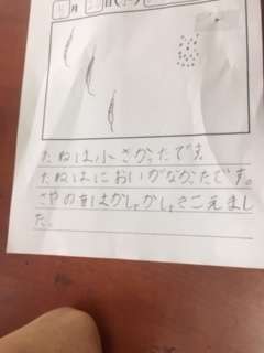 学習園に残っていたアブラナの種を観察しました。鞘を開けてみるとたくさんの種が出てきました。色や形、手ざわり、思ったことなどをカードに書きました。