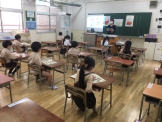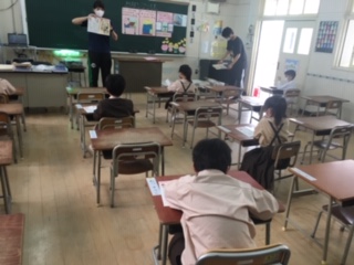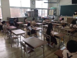 教室に入ってプリントなどを出した後、静かに先生の話を聞いています。