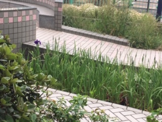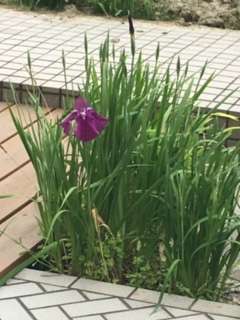 ビオトープの菖蒲の花が咲き始めました。たくさんつぼみがついています。