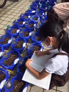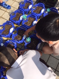 マリーゴールド、ホウセンカ、ヒマワリの花を種から育てます。それぞれの種の特徴を観察して、先週種をまきました。早速かわいい芽が出てきました。「これは、どの花の芽かな?」と、じっくり観察していました。毎日の登校時に、水やりや観察をしていきます。