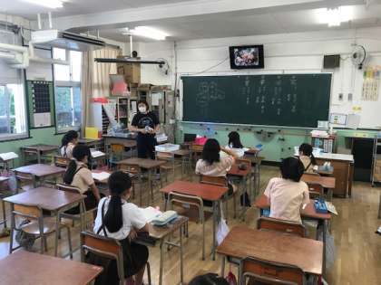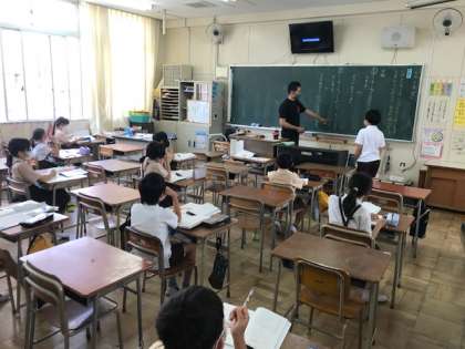 国語科では、漢字学習のあと、なぜヤドカリは、いくつものイソギンチャクを貝がらに付けているのか調べました。