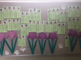 階段の踊り場に掲示してあります。「自主的に動いて、先生に頼らないようにしたい」「低学年の手本になるようにがんばる」「将来外国に留学したいので英語を頑張る」「家庭科がスタートするので頑張る」などの目標がズラリ!さすがですね。