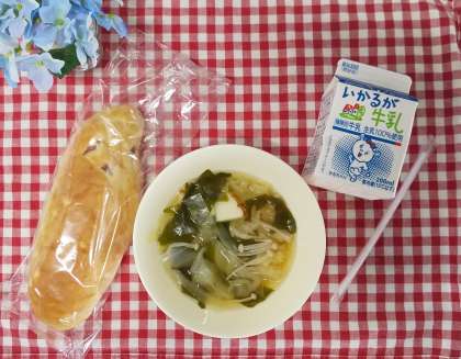 今日は、おさつパン、すまし汁、牛乳でした。給食の汁物は、だし昆布と削り節でだしをとっています。だしの良い香りとうま味で塩分控えめで食べることができます。