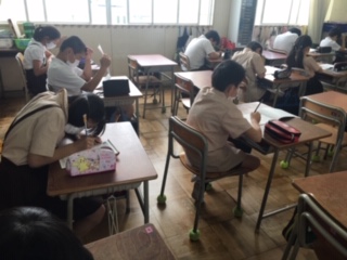 漢字学習の後、テストをしています。算数は、多角形の内角の和の求め方を考えました。