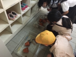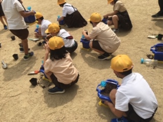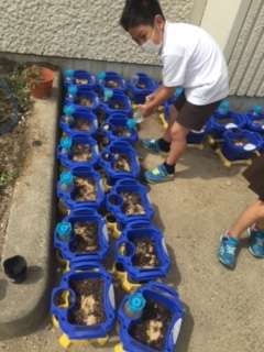 種を撒いて育ててきたミニトマトの苗を自分の植木鉢に植え替えました。ぬかを肥料として入れています。