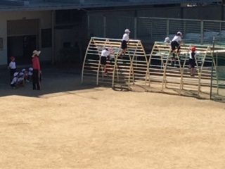 遊具(肋木)の上り方、手の位置つき方などを聞いた後上まで上りました。プールが見えたかな?
