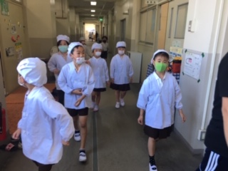 3年生以上は給食当番が、給食室まで食器やおかずなどを取りに行って配膳をしています。3年生の給食は、職員室まで運んでもらったものを取りに行きます。職員室の先生たちや給食調理員さんが、職員室まで運んでくださっています。