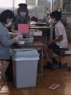 今日から聴力検査が始まりました。数人ずつ静かに保健室に入り、検査をしてもらいます。イヤホンは一人ずつ消毒をしています。