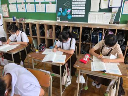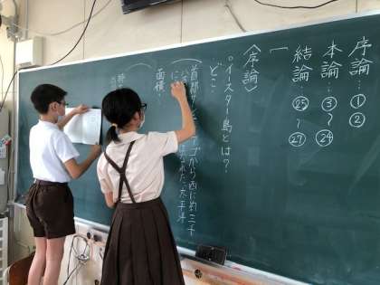 説明文「イースター島にはなぜ森林がないのか」の学習では、接続語や文末表現を根拠に序論・本論・結論を区分した後、序論の内容を自分で読み取り、ノートに整理しました。
