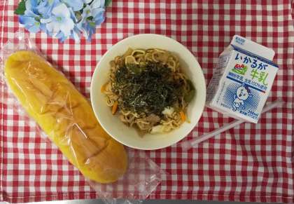 今日は、パンプキンパン、やきそば、牛乳でした。給食の焼きそばには豚肉やいかの他に、キャベツ、たまねぎ、ピーマン、にんじんなどたくさんの野菜が入っています。1年生もやきそばおかわりしてくれていました。