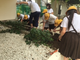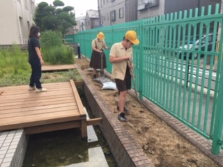 飼育栽培委員会は、話し合い活動の後、運動場、ビオトープに出て野菜の水やりや土を耕したりマリーゴールドの苗を植えたりしました。