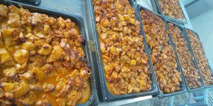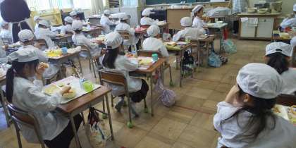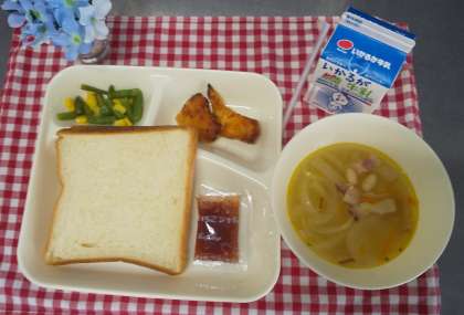 今日は、鶏肉のカレーマヨネーズ焼き、てぼ豆のスープ、さんどまめとコーンのサラダ、食パン、いちごジャム、牛乳でした。鶏肉はにんにく、塩、カレー粉、こしょう、マヨネーズ、ケチャップを合わせたもので下味をつけて蒸し焼きにしました。ご家庭ではフライパンでも油をひかずに焼くだけで作ることができます。暑い日にも食べやすいおかずで子どもたちにも人気です。