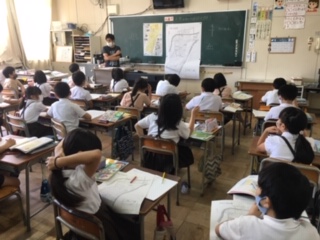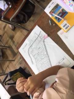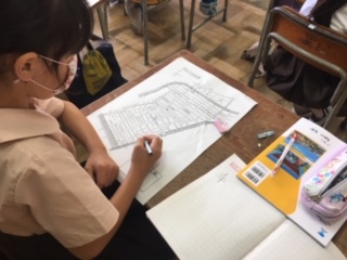 屋上から見た校下の様子を、地図に表していきました。大宮小学校の周りには、学校や幼稚園が多いことがわかりました。