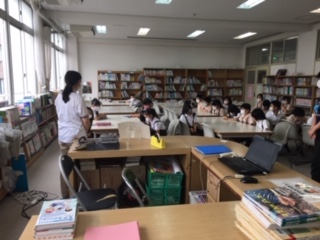 2年生になって初の図書室です。今年度から木曜日、図書室でアドバイスなどをしてくださるI先生と初対面です。図書室のルールを確認した後、本棚には、どんな番号がついているか、グループでその番号のところにはどんな本があるのかなどを見ていきました。