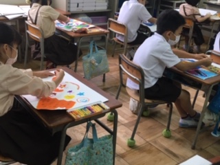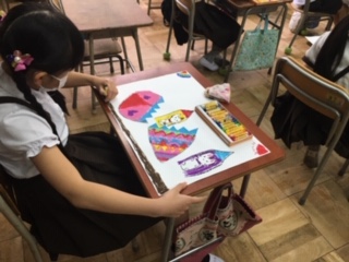 「ふしぎなたまご」を描きました。たまごの中からいろんなものが飛び出します。子どもたちのイメージが、豊かに広がります。