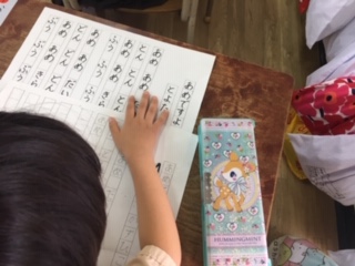 一日に3から4文字ずつひらがな学習をしています。習った文字を使って「あめですよ」を視写しました。