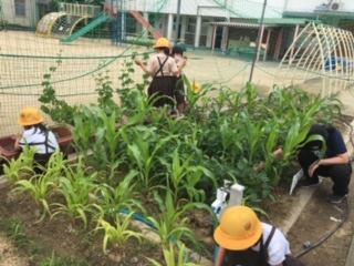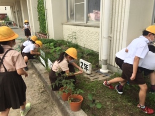 学習園のサツマイモやトウモロコシなどが大きく育ってきました。雑草もたくさん生えています。雑草ひきをみんなで頑張りました。この雑草は、堆肥にする予定です。