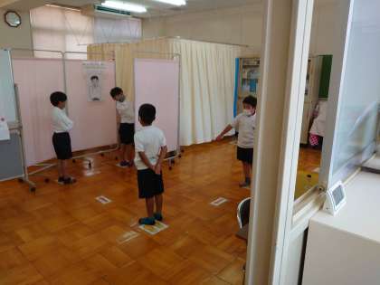 学校医の先生に来てもらい、間隔をあけてしっかりとルールを守りながら、内科検診を行いました。