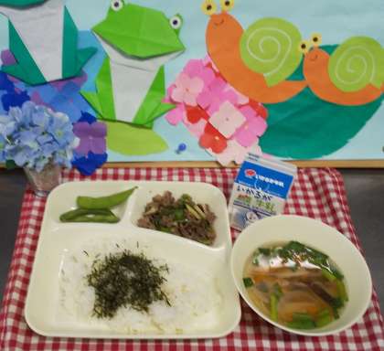 今日は、チンジャオニューロウス—、ハムと野菜の中華スープ、えだまめ、きざみのり、ごはん、牛乳でした。チンジャオニューロウス—は、ピーマンと牛肉を細く切って炒めた中国の料理です。ピーマンが苦手な子も「おかわりする!」と、食べやすかったようです。