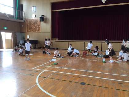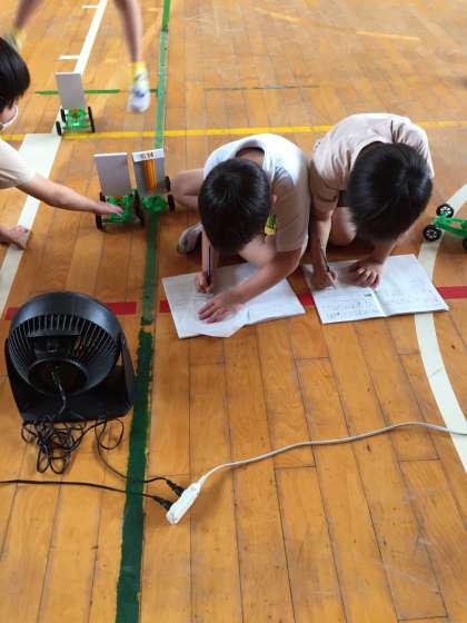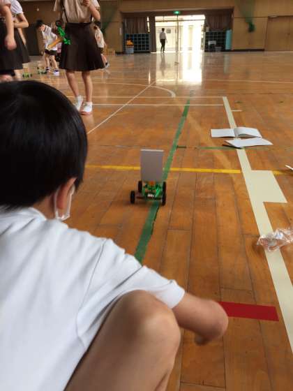 「風とゴムのはたらき」の学習です。講堂で、送風機を使って、車を走らせました。風の強さで、進む距離の違いや速さの違いを調べました。