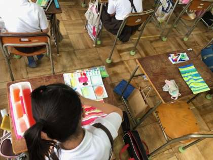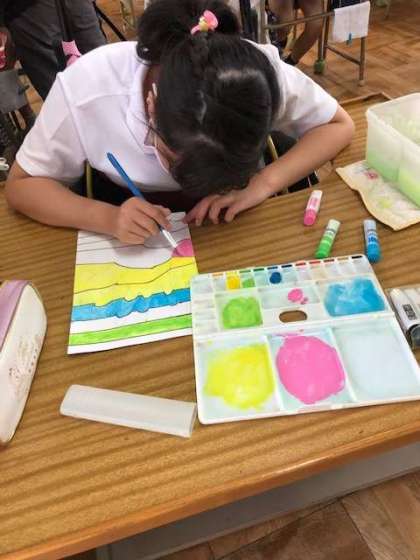 自分の手をかたどって、アートな手をかき進めています。グラデーションや寒色系、暖色系など絵の具の色の組み合わせも意識して取り組んでいます。